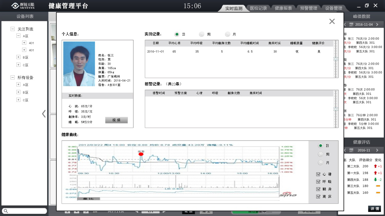 辉锐天眼特护人员健康监测系统具有实时监测、健康报表、预警管理、报警处理、设备管理等五大功能。