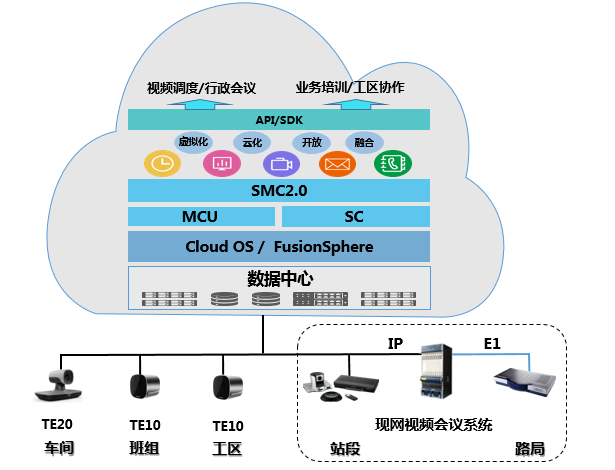 华为下一代高清视频云会议系统,符合国际主流的ITU-T H.323、H.320、IETF SIP多媒体框架协议,支持当前主流的视音频编解码协议,具有强大的兼容互通性,华为SMC2.0高清视频会议系统平台提供标准的二次开发接口,可实现与当前南宁铁路局办公系统进行无缝对接;同时,未来可与符合GB/T28181协议的主流监控系统以及eLTE应急通信系统进行对接,满足未来扩展高清视频调度指挥的场景需求;