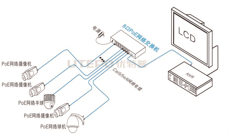实际上,根据很多工程商朋友的反馈,小功率PoE交换机才是未来市场的主流。一个33W的交换机接入4个200万像素的网络摄像机完全没问题。如果监控系统供电总功率超过93W,还可选用优特普“网电速联”系列16口/24口大功率PoE交换机,完全不用担心PoE交换机功率问题。
